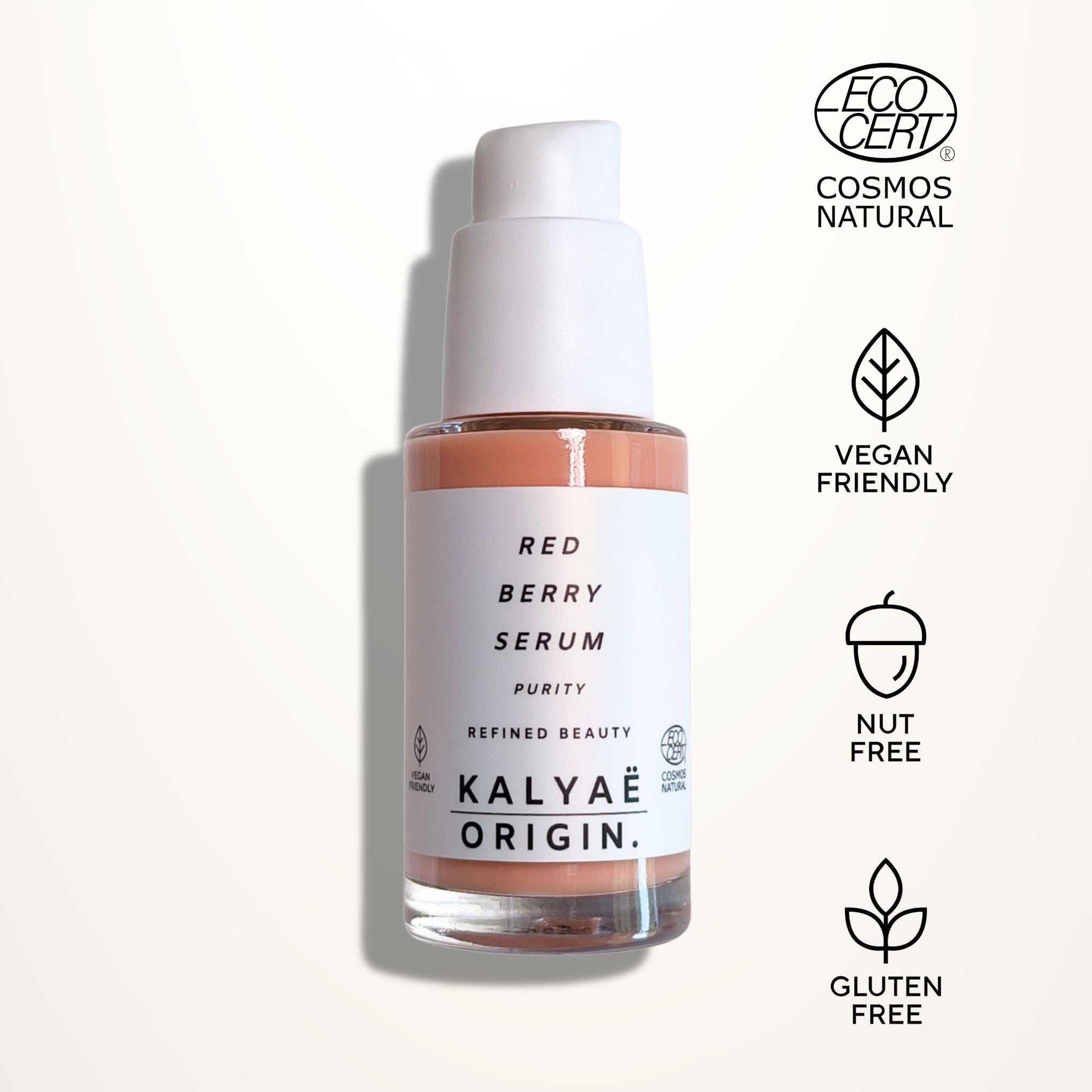 Red Berry Serum, sérum repulpant, certifié COSMOS NATURAL 30 ml presenté sur fond clair avec logos Ecocert, Vegan Friendly, Nut Free et Gluten Free – KALYAË ORIGIN